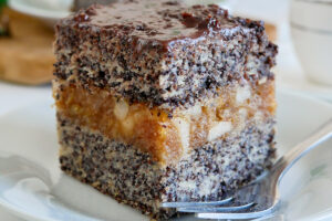 Makowiec z jabłkami i polewą czekoladową to wyjątkowe połączenie tradycyjnego ciasta makowego z delikatnym musem jabłkowym i słodką, aksamitną polewą czekoladową.